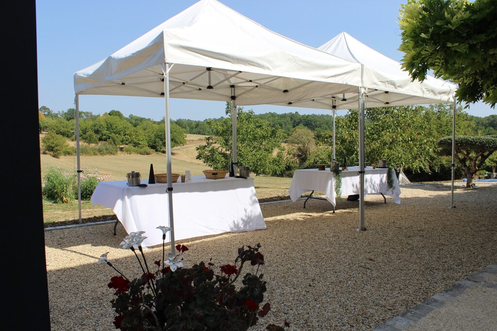 Nous mettons à disposition des tentes pliantes, idéales pour des événements ponctuels, marchés, stands ou manifestations publiques, ainsi que des tentes garden/cottage, toit pointu élégant, modulable également et parfaite pour les réceptions conviviales et lumineuses en extérieur (cocktail…).